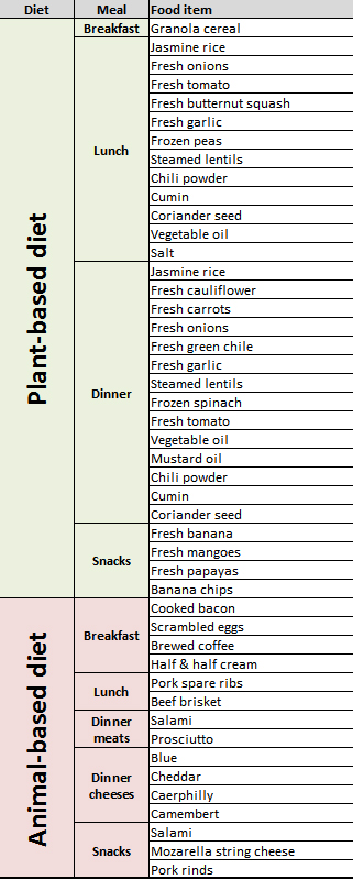 Researchers had 11 volunteers (6 male), ages 21 to 33, consume both a plant-based diet (grains, legumes, fruits, vegetables. dietary fat: 22.1% of calories, dietary protein: 10.0%, fiber: 25.6 grams per 1000 calories) and an animal-based diet (meats, eggs, cheeses. dietary fat: 69.5%, dietary protein: 30.1%, fiber: “nearly zero”) for 5 days.