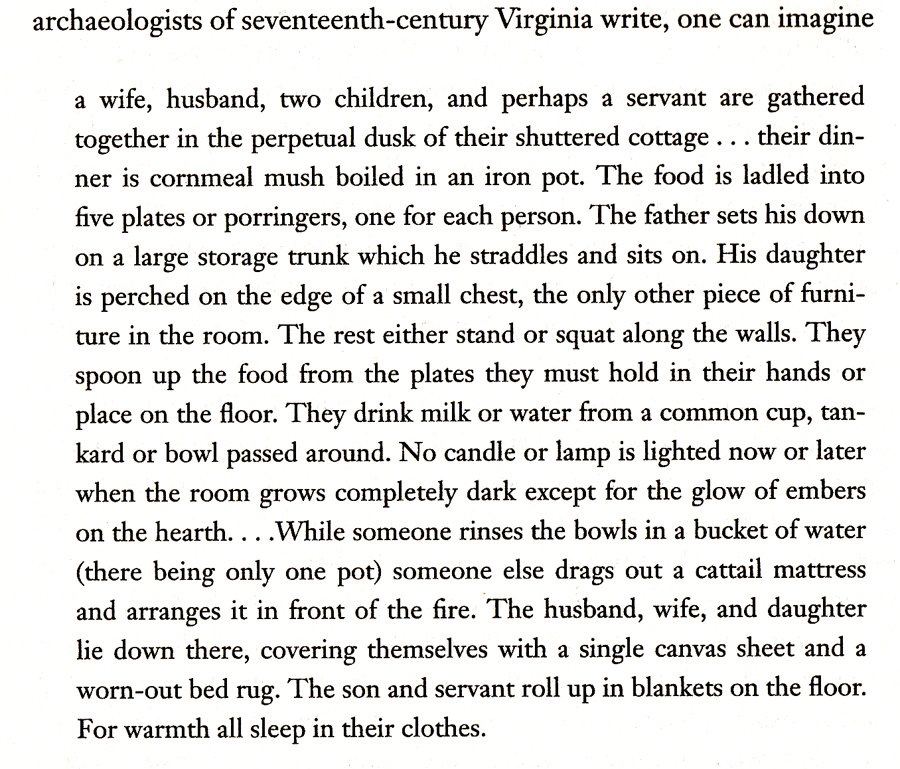 Bernard Bailyn, in his book, The Barberous Years, describes a scene of suppertime for tobacco farmers in 17th century Virginia: