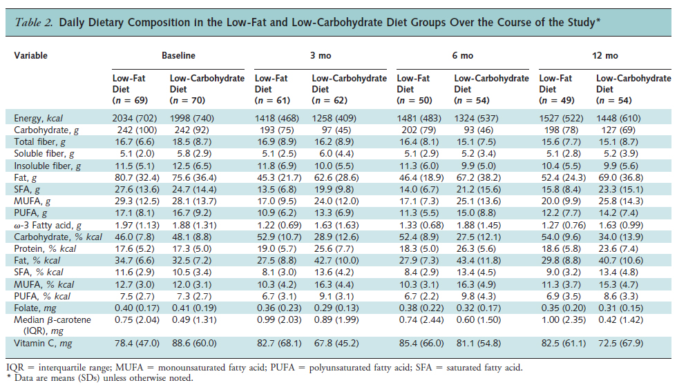 Update 4: I have my answer about how much fat the low-fat group was eating … 27.5% at 3 months, 27.9% at 6 months, 29.8% at 12 months.