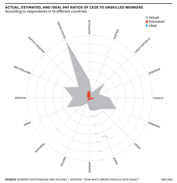 In blue is what people think CEOs should ideally earn (can you see it there in the center? It’s about 4.6 times what an unskilled worker earns), in red is their estimate of what CEOs do earn (about 10 times what workers earn), and in grey is what CEOs actually earn (no country was over 150 times except for the US at 354 times!):