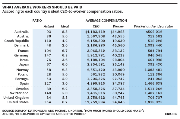 The authors calculated what an average worker’s wages would be if CEO compensation remained what it is, but workers wages were brought in line with what respondents thought was fair or ideal: