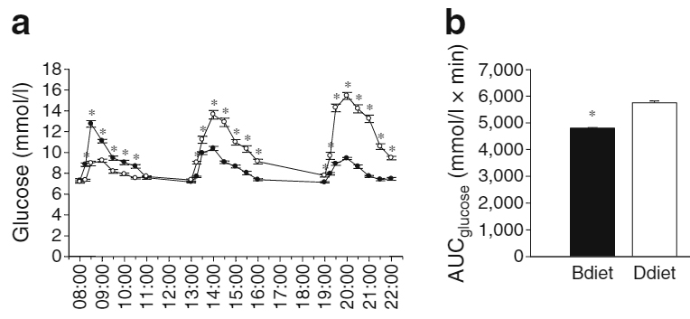 Despite the diets being isoenergetic, lunch resulted in lower glucose (by 21–25%) and higher insulin (by 23%) with the Bdiet vs Ddiet.