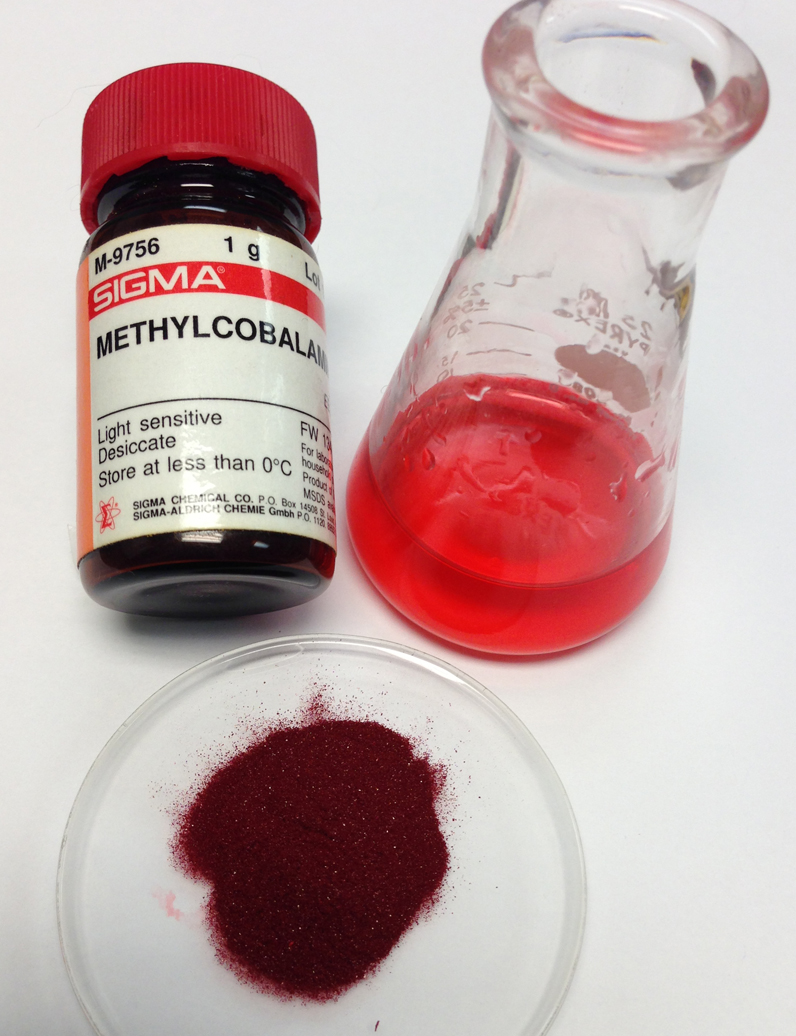 “Methylcobalamin (shown) is a form of vitamin B12. Physically it resembles the other forms of vitamin B12, occurring as dark red crystals that freely form cherry-colored transparent solutions in water.” – Wikipedia