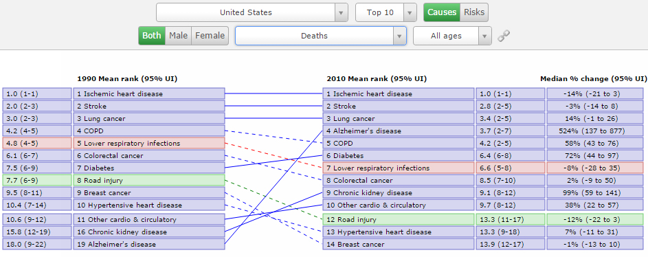 This is a great interactive tool from the Institute for Health Metrics and Evaluation (IHME). It gives a clean, visual representation of the change in burden of disease over the last 20 years. Here’s a snapshot of the top 10 causes of death in the US: