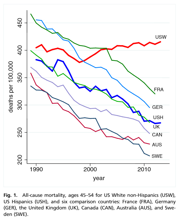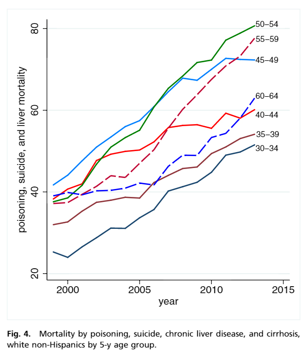 Here’s the mortality graph that’s all over the media. Note that red line (white Americans age 45-54) that increases while all the other lines decrease: