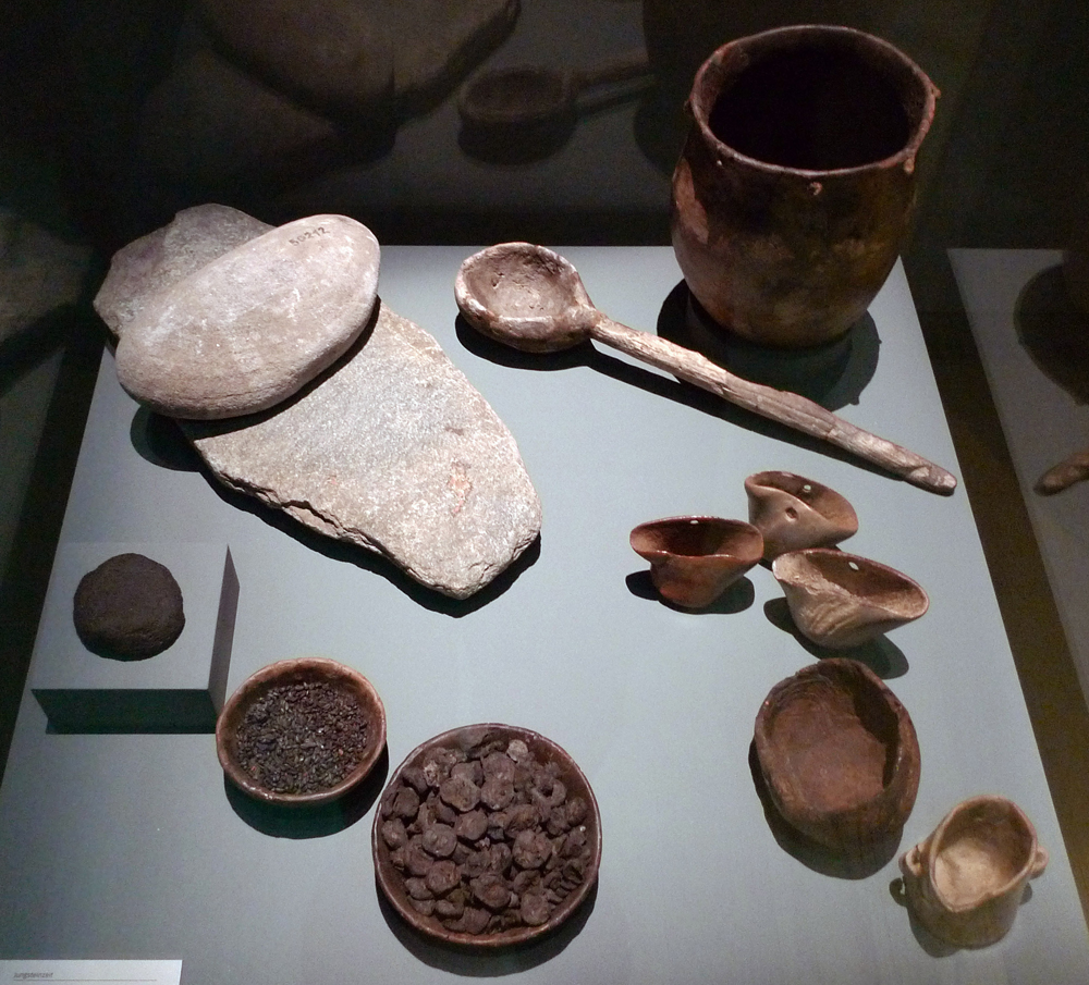 Food and cooking items retrieved at a European Neolithic site: millstones, charred bread, grains and small apples, a clay cooking pot, and containers made of antlers and wood. Wikipedia: Neolithic