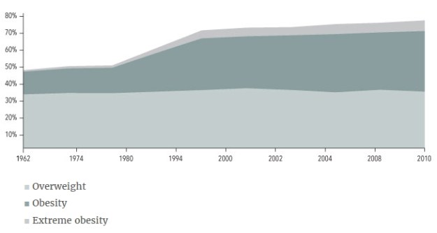 Here’s a simple visual from the NIH that shows how Americans’ weight has changed over time. What was going on in the latter part of the 20th century that could have caused that blip up, and maintained it?