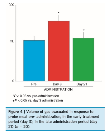 RESULTS: At the beginning of administration, HOST-G904 significantly increased the number of daily anal gas evacuations (18 ± 2 vs. 12 ± 1 pre-administration; P < 0.001) and the volume of gas evacuated after the test meal (236 ± 23 mL vs. 160 ± 17 mL pre-administration; P = 0.006). However, after 3 weeks of administration, these effects diminished (11 ± 2 daily evacuations, 169 ± 23 mL gas evacuation). At day 21, relative abundance of butyrate producers (Lachnospiraceae) correlated inversely with the volume of gas evacuated (r = -0.52; P = 0.02).