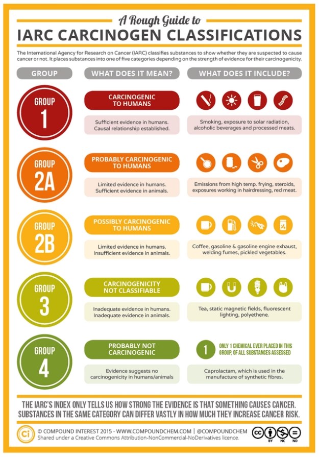Cigarettes cause cancer, radiation causes cancer, alcohol causes cancer, processed meat causes cancer. They are all carcinogenic to humans. But: