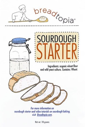 Years ago I tried making my own starter by setting out a bowl of flour and water and hoping some wild yeast would alight. I never had much luck, so this time I bought a little ball of live starter. Mail order! From Breadtopia. So far so good.