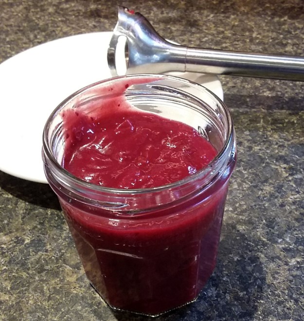 - When cool, blend on high with a hand blender. Because it’s thick you’ll have to stop once or twice to scrape off the sauce that sticks to the outside of the wand. I don’t strain away any skins and blending doesn’t get rid of all of them but it’s good enough for me.