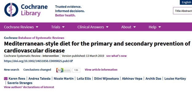 Mediterranean‐Style Diet For The Primary And Secondary Prevention Of Cardiovascular Disease, Cochrane Library, 19 March 2019