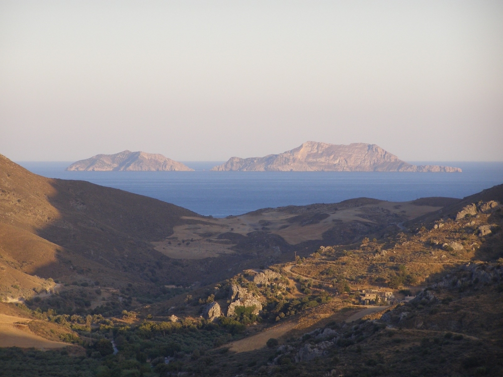 Here are two uninhabited islands called Paximadia off the southern coast of Crete. In the foreground is the monastery Preveli in Crete.