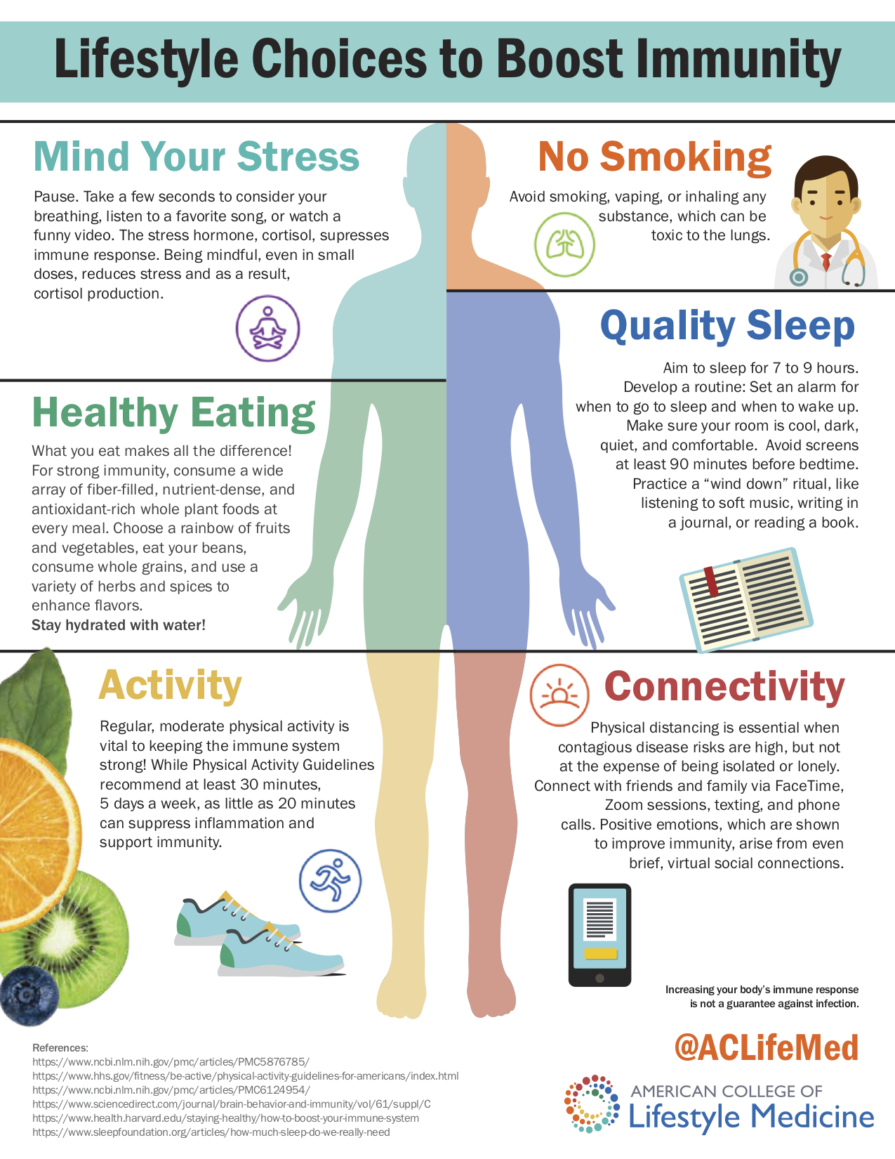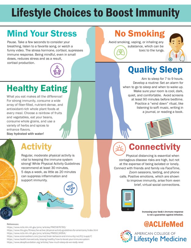 - I support commonsense advice to stay healthy during the crisis, as recommended by trusted authorities such as the American College of Lifestyle Medicine and the World Health Organization, including getting sufficient sleep (seven to nine hours), reducing stress, keeping active, staying connected (remotely) to friends and family, and eating healthfully (a diet centered around whole plant foods).