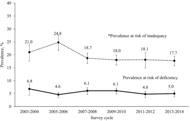 In conclusion, the prevalence of the US population at risk of vitamin D deficiency has remained fairly stable, ∼5%, over the past decade, from 2003 to 2004 through 2013 to 2014. The prevalence of at risk of vitamin D inadequacy decreased from 21% to 17.7%.