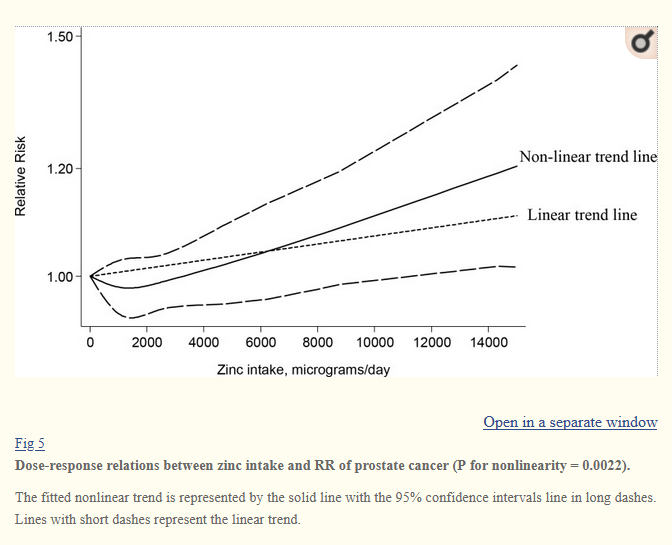 Using a dose-response meta-analysis, we observed a non-linear trend in the relationship between zinc intake and prostate cancer (p for nonlinearity = 0.0022).
