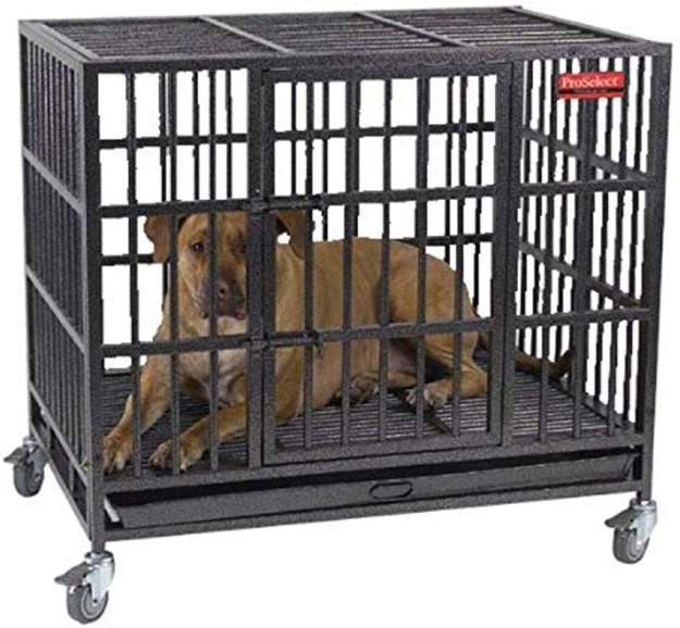 You can purchase this cage on Amazon for $600. You can see from the other photos that a dog this size can barely stand without hitting the bars. Marketed with “a grate at the bottom for easy cleanup.” To me this is abusive.
