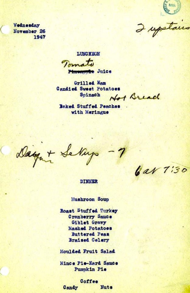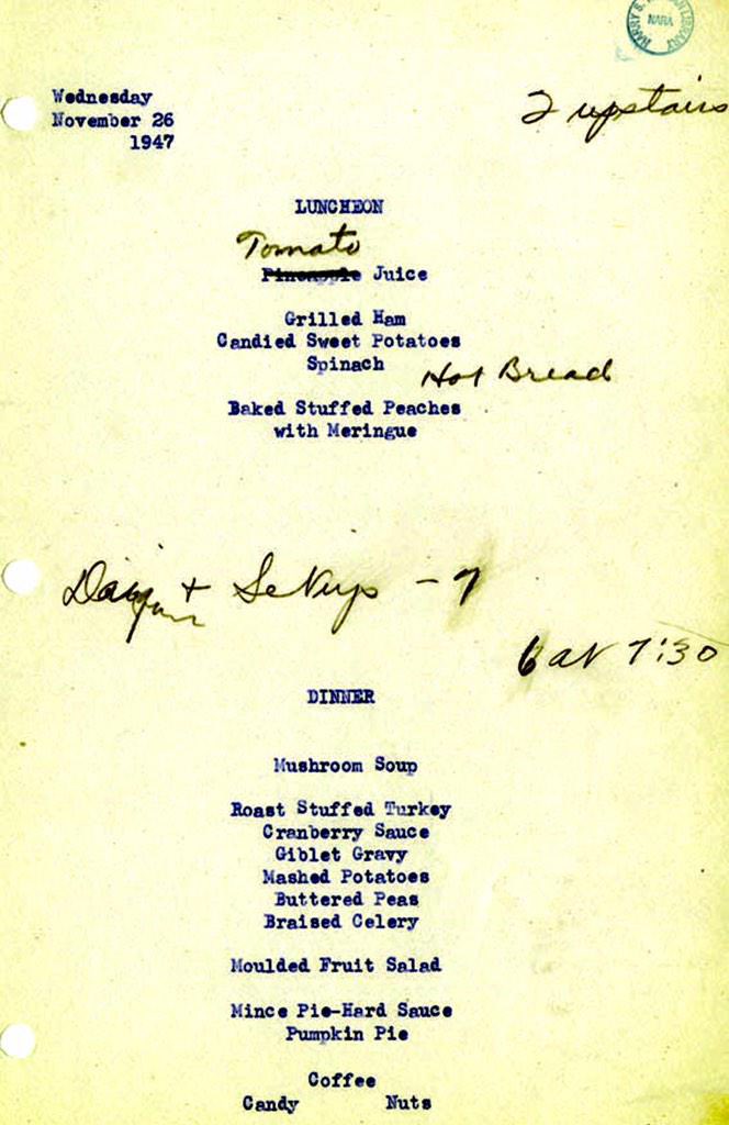 President Harry Truman’s White House Thanksgiving Day Menu, 1947 Leave a reply Source: Michael Beschloss Happy Thanksgiving, everyone! Click to share on X (Opens in new window) X Click to share on Facebook (Opens in new window) Facebook More Click to share on Reddit (Opens in new window) Reddit Click to email a link to a friend (Opens in new window) Email