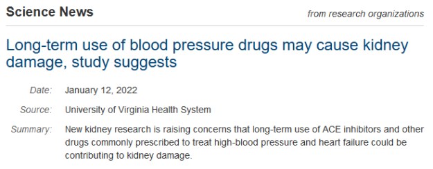 Long-term use of blood pressure drugs may cause kidney damage, study suggests, Science Daily