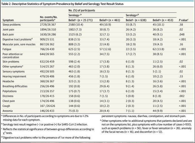 Conclusions and Relevance: The findings of this cross-sectional analysis of a large, population-based French cohort suggest that persistent physical symptoms after COVID-19 infection may be associated more with the belief in having been infected with SARS-CoV-2 than with having laboratory-confirmed COVID-19 infection. Further research in this area should consider underlying mechanisms that may not be specific to the SARS-CoV-2 virus. A medical evaluation of these patients may be needed to prevent symptoms due to another disease being erroneously attributed to “long COVID.”
