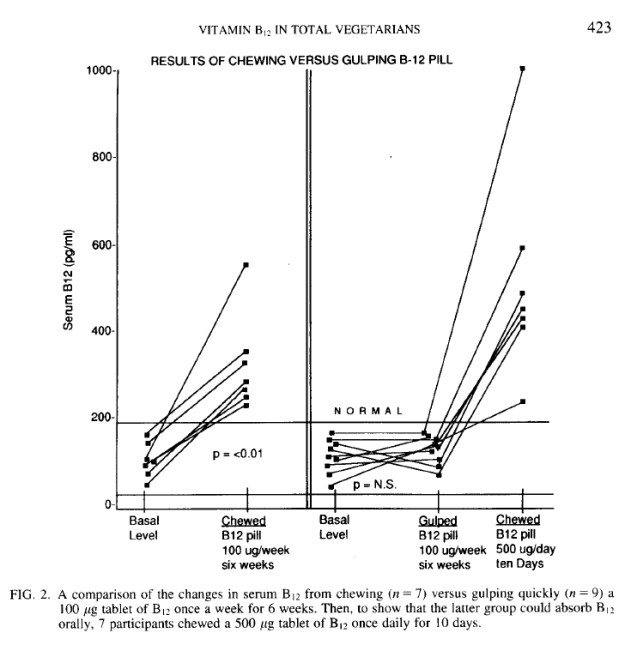 The serum B12 level of seven of 16 adults with a low serum B12 who chewed a 100 μg tablet of B12 once a week for 6 weeks increased by 150%, whereas the serum B12 level increased by only 12% in the nine who gulped down the tablets (with water).