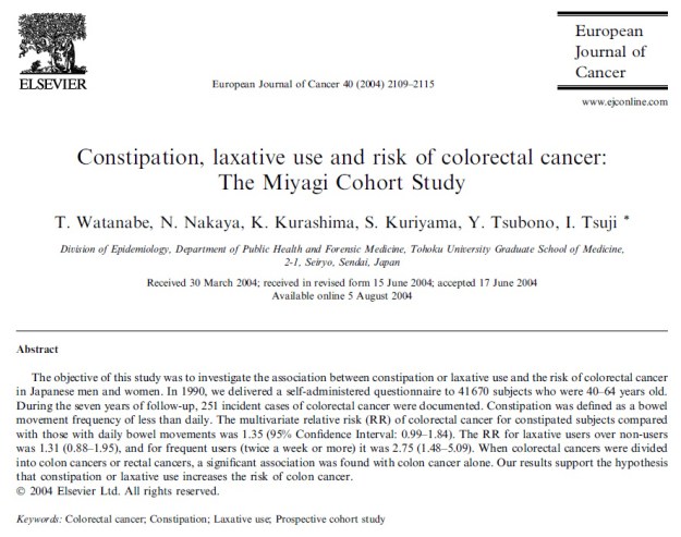 Constipation, laxative use and risk of colorectal cancer: The Miyagi Cohort Study, European Journal of Cancer, September 2004