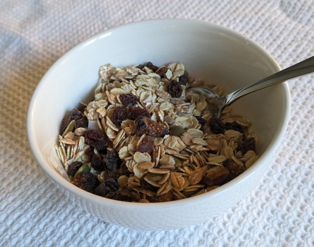 Muesli is a cold Swiss breakfast dish, the primary ingredient of which is rolled oats. Traditionally it is set to soak overnight and eaten the next morning. Additional ingredients, such as grains, nuts, seeds, and fresh or dried fruits, are added, along with milk or cream, a squeeze of citrus juice, and honey to add sweetness. Yoghurt or other mammal or plants milk products are now commonly added to both homemade and commercially packaged muesli recipes.