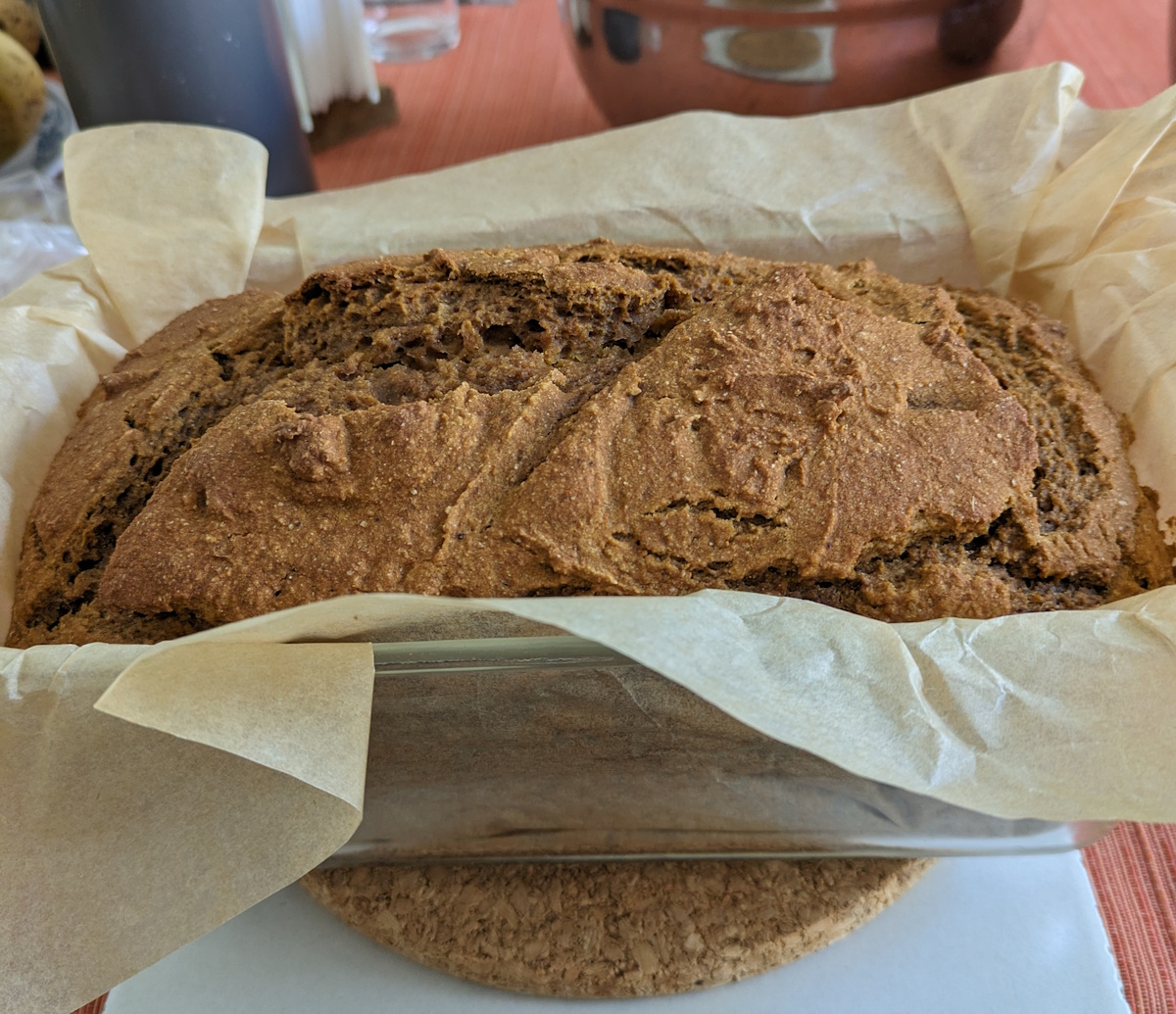My spicy pumpkin gingerbread. I line the entire pan with parchment because it’s easy to remove from the pan and clean-up is easy. Some wrinkles on the loaf but that’s ok with me.