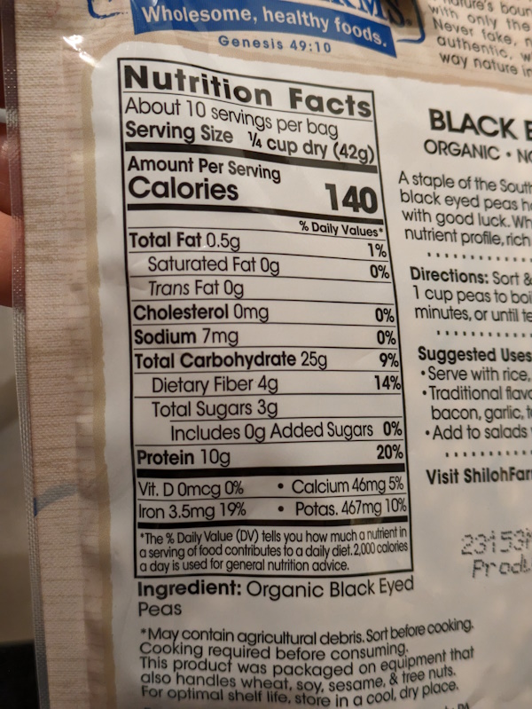 I bought some black-eyed peas to pad out a Vitacost order. I haven’t made them in a while. In my experience, peas (like black-eyes, split peas, and chick peas) take about half the time to cook compared to beans. With the exception of split peas they tend to stay more intact. And look at this protein content! Ten grams of protein in a quarter cup of dry beans. Kidney beans, pinto, Great Northern … they only have about 8 or 9 grams of protein. Pretty respectable iron content too.