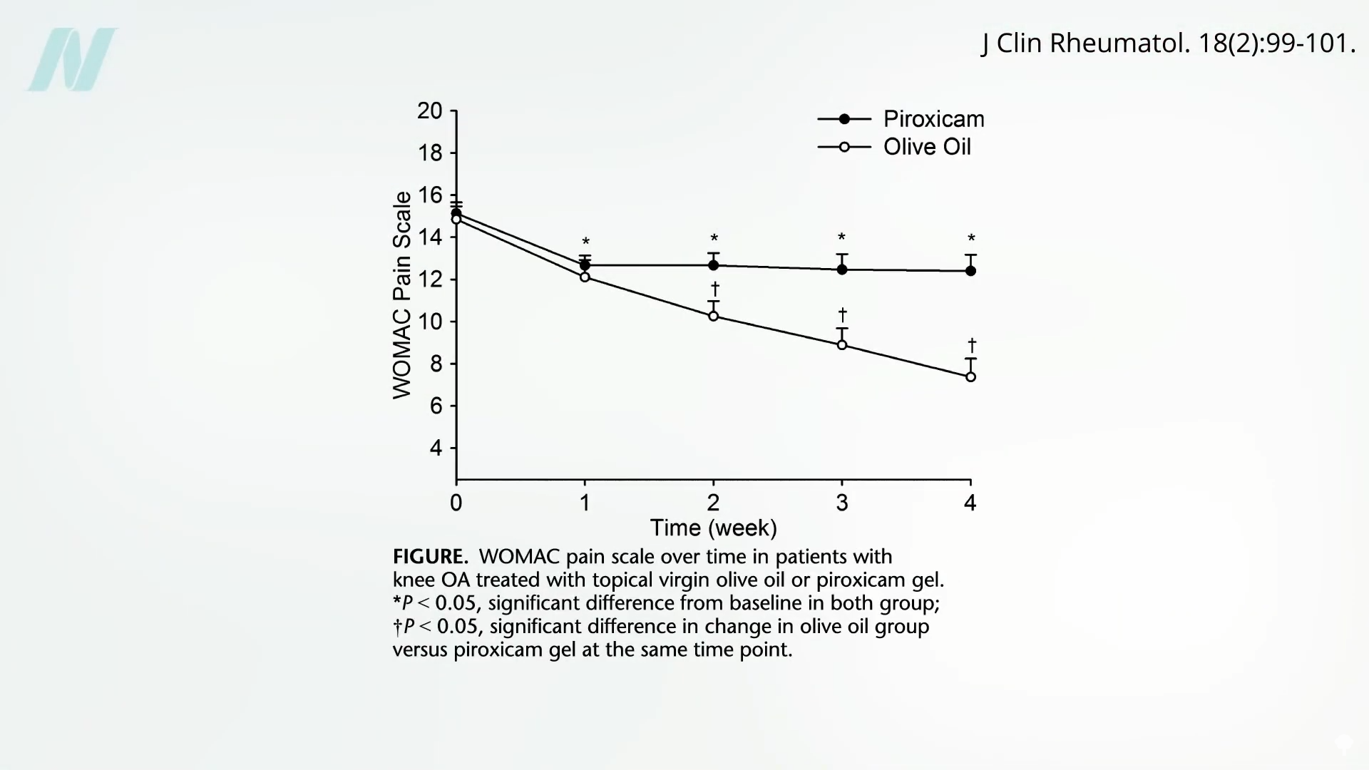 A pilot double-blinded, randomized, clinical trial of topical virgin olive oil versus piroxicam gel in osteoarthritis of the knee, Journal of Clinical Rheumatology, 2012