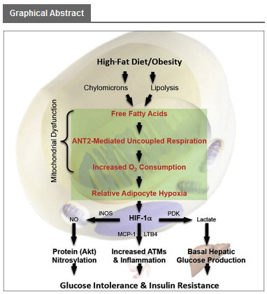 They observed that the abundant saturated fatty acids in the diet activated adenine nucleotide translocase 2 (ANT2) … [which] caused increased oxygen consumption, which meant less was available for the rest of the cell. The result was a relative state of hypoxia or inadequate oxygen supply, one that subsequently induced production of a protective transcription factor in fat cells called HIF-1alpha. In turn, HIF-1alpha triggered release of chemokines, proteins that signal cellular distress, launching the immune system’s inflammatory response. A sustained high-fat diet ensured that the process continued unabated, leading to obesity, chronic low-grade tissue inflammation and eventually, insulin resistance in the mice.