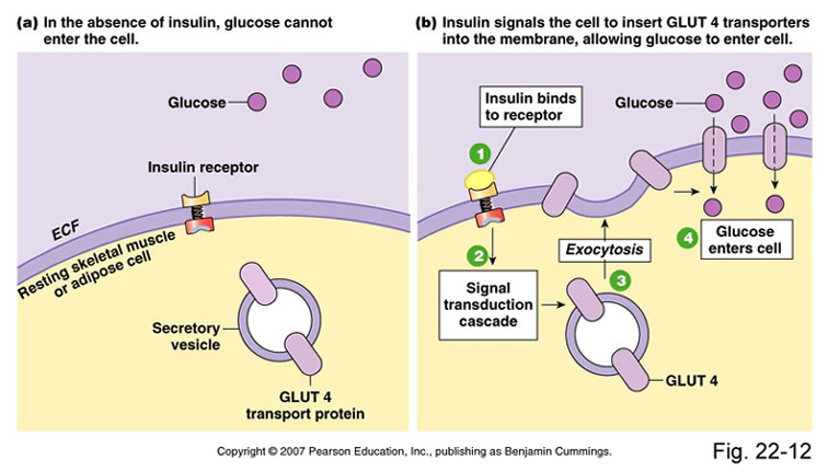 One mechanism by which dietary fat decreases insulin sensitivity, raising blood glucose and insulin levels is through reduced action of the glucose transporter GLUT4. There seems to be both a reduced expression of the GLUT4 gene, and a reduced translocation or movement of GLUT4 to the cell membrane in the presence of a high-fat, especially high-saturated fat diet.  (GLUT4 is one of the glucose transport proteins that move glucose from the bloodstream into muscle and fat cells. Its insertion into the membrane is controlled by insulin. See diagram.)